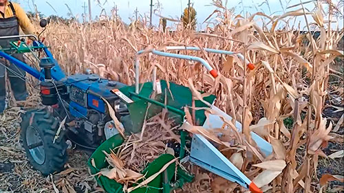 Що стосується кукурудзи та її збирання, то тут вам на допомогу прийдуть китайські умільці. Є техніка трохи більше, є техніка трохи менше, до водяного мотоблока. Але, як ви вже знаєте, все те, що працює на ньому, можна пристосувати й до мототрактора.